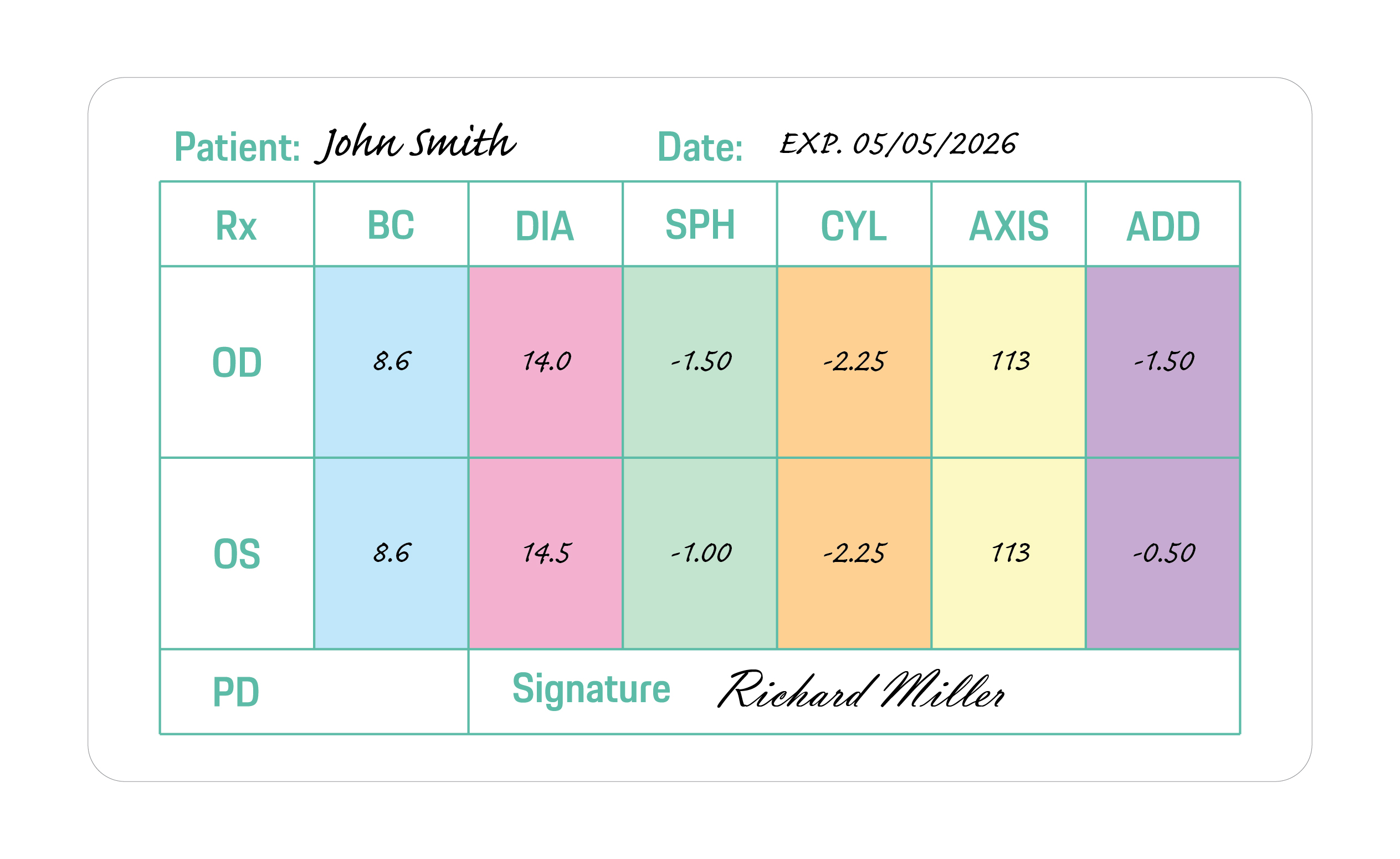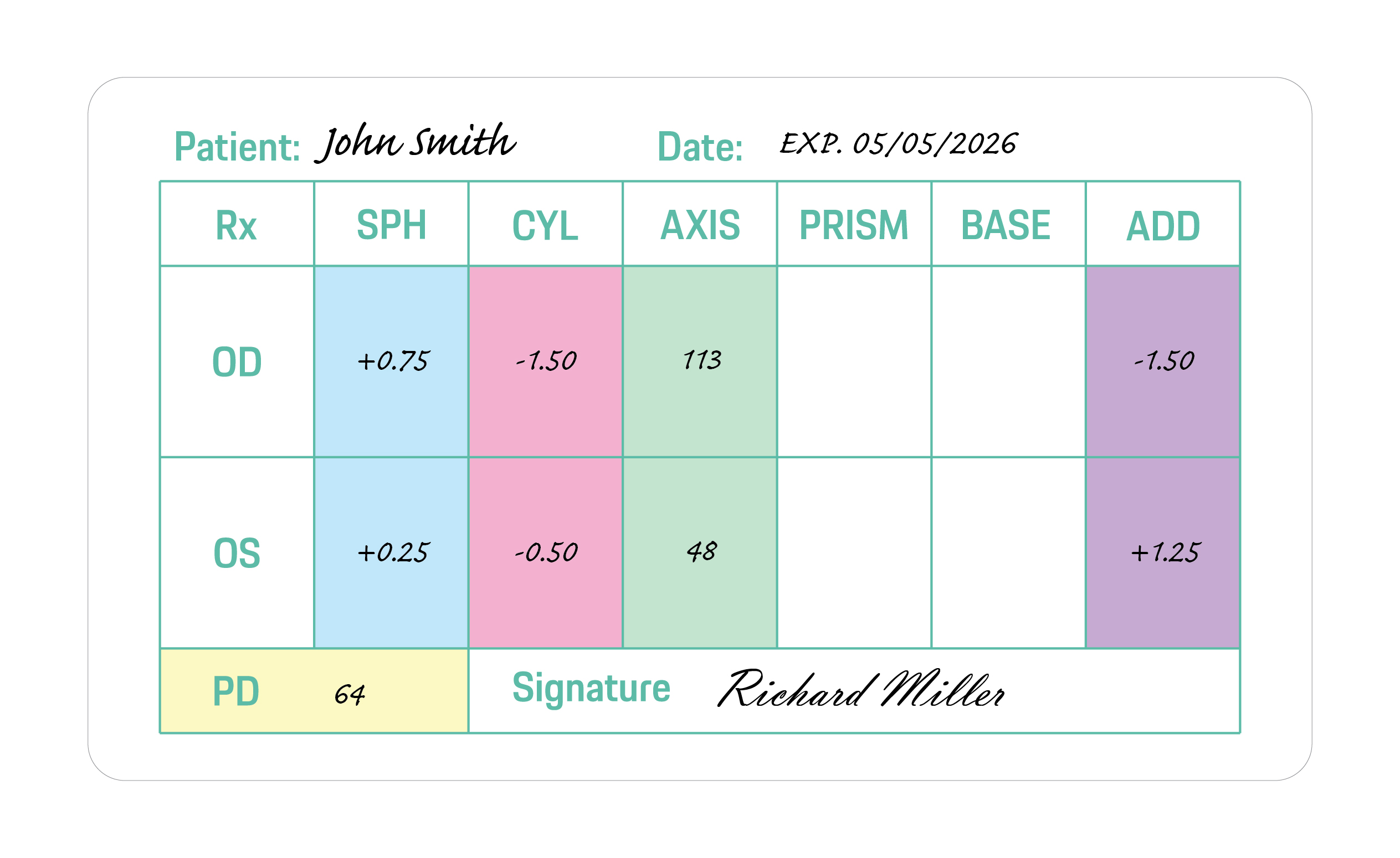 ADD is short for "additional correction." This is where details about bifocals, multifocal lenses or progressive lenses would appear.
